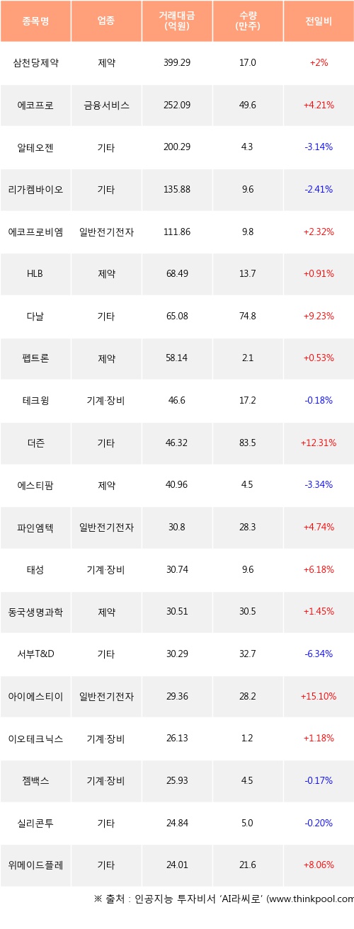 삼천당제약, 에코프로, 에코프로비엠 등은 전일 대비 주가가 상승했고, 알테오젠, 리가켐바이오, 테크윙 등은 주가가 하락했다.