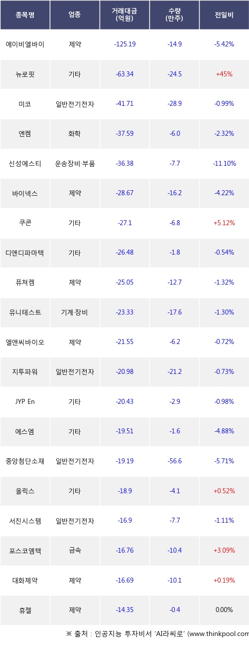 외국인 투자자의 순매도 상위 20개 종목은 에이비엘바이오, 뉴로핏, 미코, 엔켐, 신성에스티, 바이넥스, 쿠콘, 디앤디파마텍, 퓨쳐켐, 유니테스트등이다.