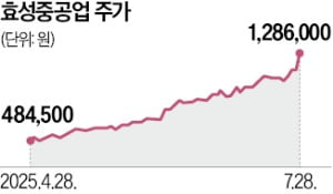 28일 유가증권시장에서 효성중공업은 14.31% 오른 128만6000원에 마감했다. 산일전기(13.55%), 일진전기(4.43%), LS일렉트릭(1.57%) 등 다른 전력기기 관련주도 일제히 상승했다. 효성중공업의 올해 주가 상승률은 216%에 달한다.전력기기 슈퍼사이클이 실적으로 확인되면서 주가가 급등했다는 설명이다. 효성중공업은 지난 2분기 매출 1조5253억원, 영업이익 1642억원으로 각각 전년 동기 대비 27.8%, 161.9% 증가했다고 이날 밝혔다. 이동헌 신한투자증권 연구원은 “미국 관세 불확실성에도 역대 최대 수주 실적으로 전력기기 시장이 공급자 우위 시장임을 입증했다”고 말했다.