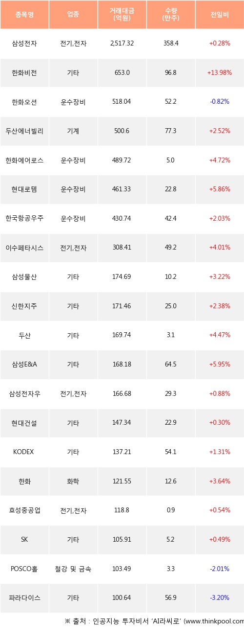 외국인 투자자의 순매수 상위 20개 종목은 삼성전자, 한화비전, 한화오션, 두산에너빌리티, 한화에어로스페이스, 현대로템, 한국항공우주, 이수페타시스, 삼성물산, 신한지주등이다.