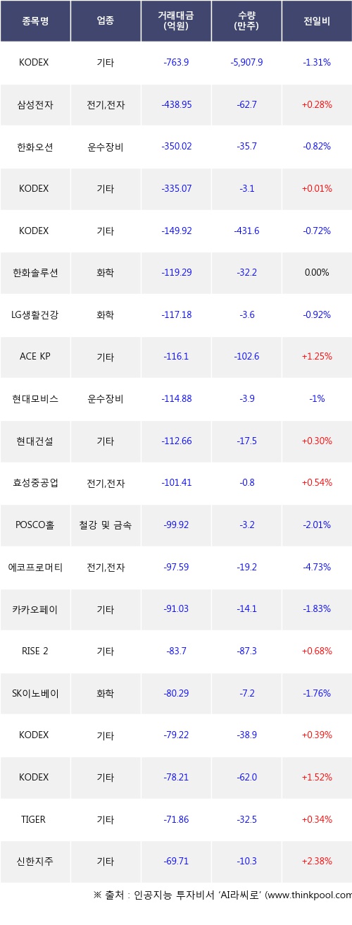 기관 투자자의 순매도 상위 20개 종목은 KODEX 200선물인버스2X, 삼성전자, 한화오션, KODEX CD금리액티브(합성), KODEX 인버스, 한화솔루션, LG생활건강, ACE KPOP포커스, 현대모비스, 현대건설등이다.