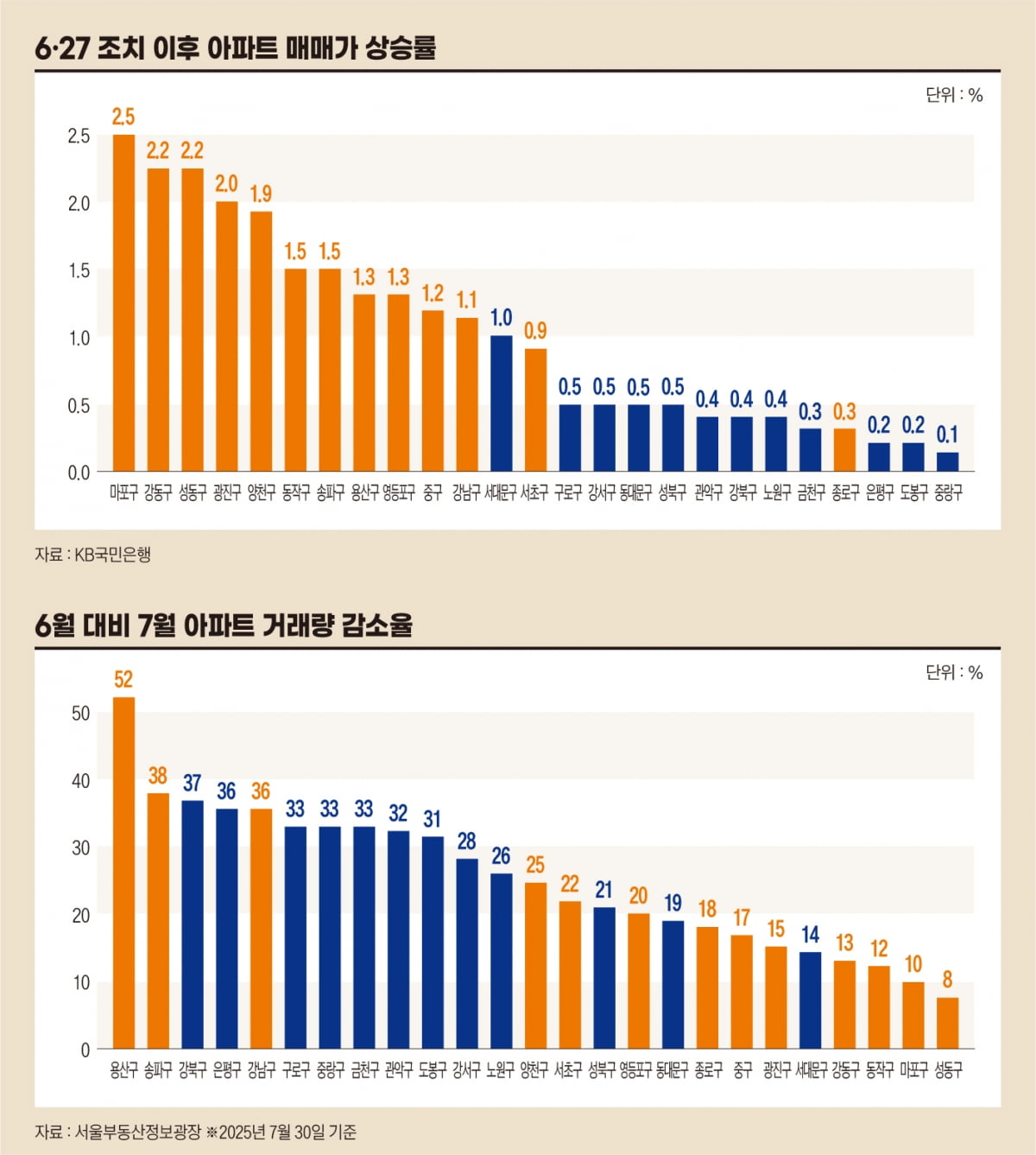 위 표에서 알 수 있듯이 저가 지역(파란색)보다는 고가 지역(빨간색)의 거래량 감소가 심한 것을 알 수 있다. 6·27 조치의 여파로 대출을 많이 필요로 하는 고가 지역은 거래 감소를 피할 수 없는 것이다.