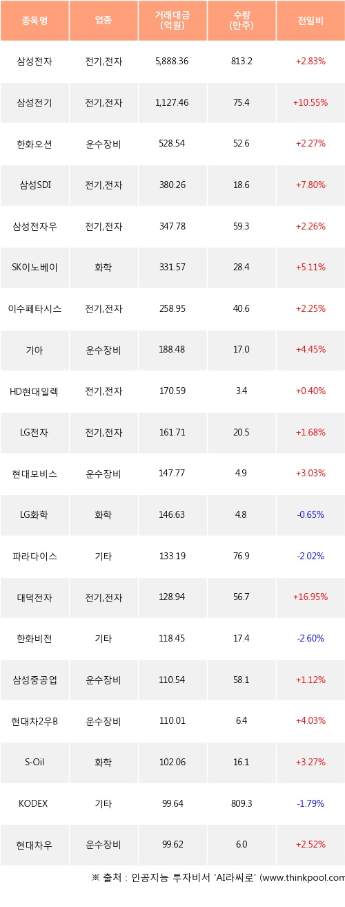 외국인 투자자의 순매수 상위 20개 종목은 삼성전자, 삼성전기, 한화오션, 삼성SDI, 삼성전자우, SK이노베이션, 이수페타시스, 기아, HD현대일렉트릭, LG전자등이다.
