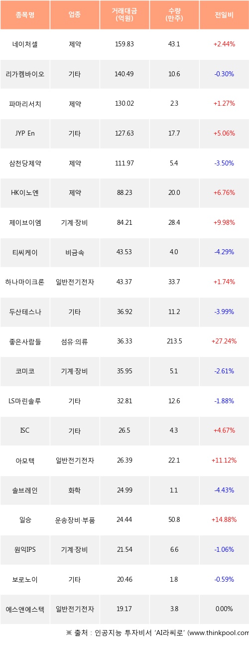네이처셀, 파마리서치, JYP Ent. 등은 전일 대비 주가가 상승했고, 리가켐바이오, 삼천당제약, 티씨케이 등은 주가가 하락했다.