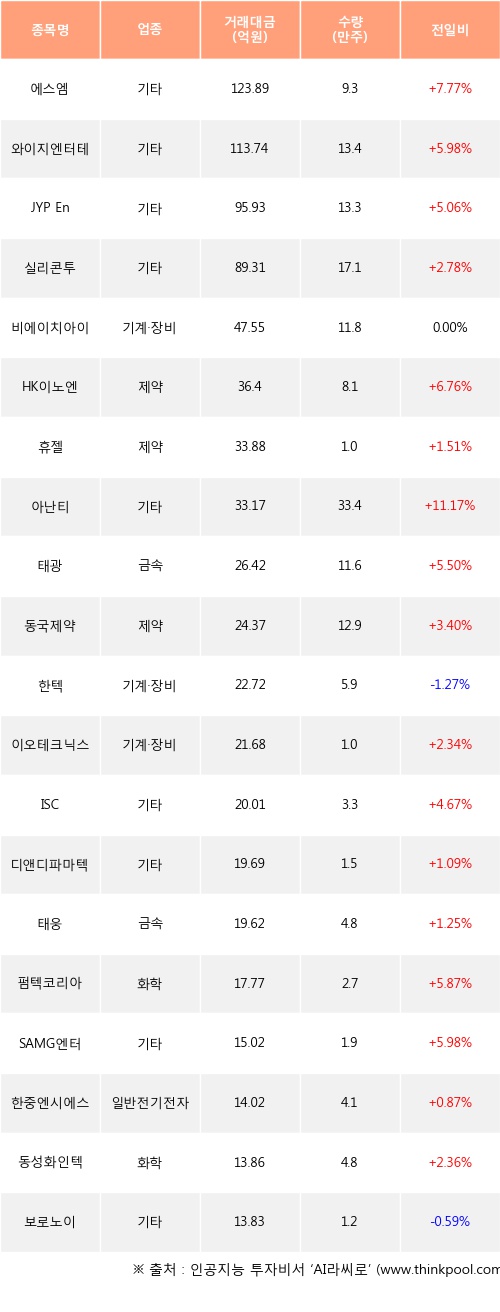 기관 투자자의 순매수 상위 20개 종목은 에스엠, 와이지엔터테인먼트, JYP Ent., 실리콘투, 비에이치아이, HK이노엔, 휴젤, 아난티, 태광, 동국제약등이다.