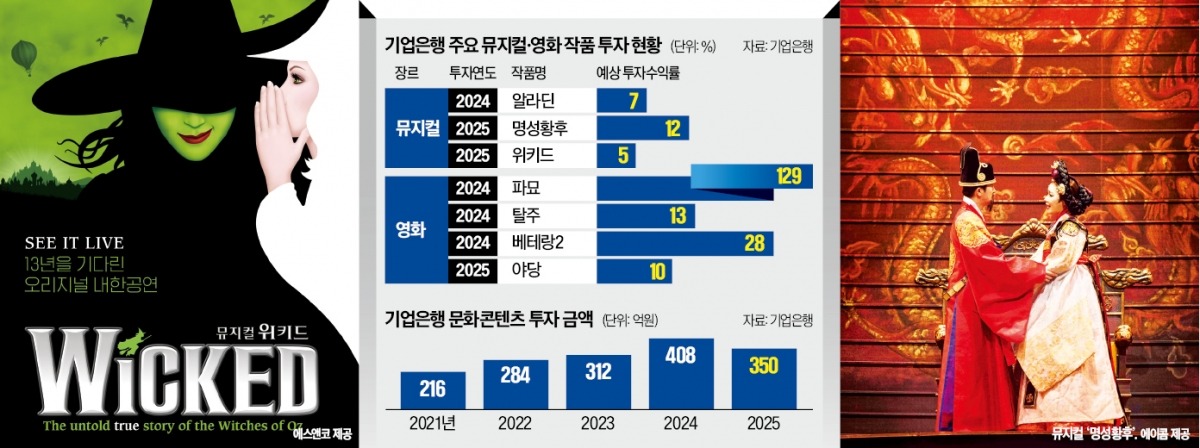 블록버스터 뮤지컬 ‘위키드’와 한국 순수 창작 뮤지컬 ‘명성황후’. 올해 국내 뮤지컬 시장을 대표하는 두 작품 사이에는 숨은 공통점이 있다. 기업은행이 투자한 작품이라는 점이다.