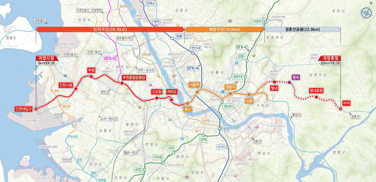 GTX-B 노선은 총 9개 정거장과 1개의 차량기지를 포함하며, 이 중 민자 구간은