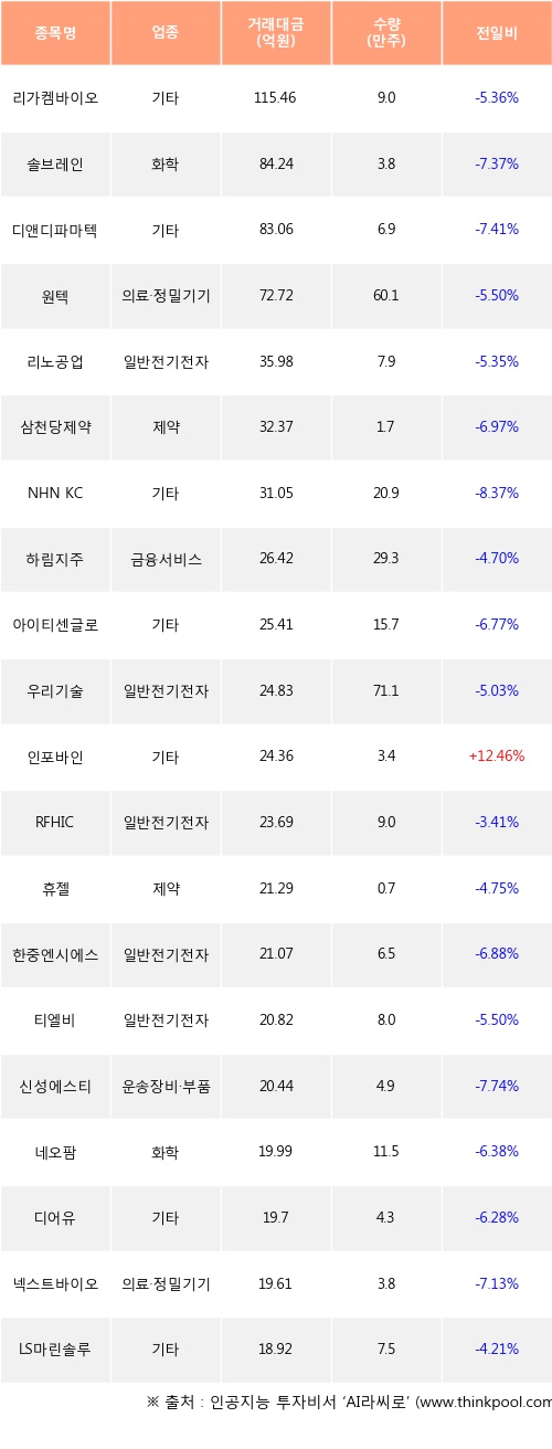 인포바인 등은 전일 대비 주가가 상승했고, 리가켐바이오, 솔브레인, 디앤디파마텍 등은 주가가 하락했다.