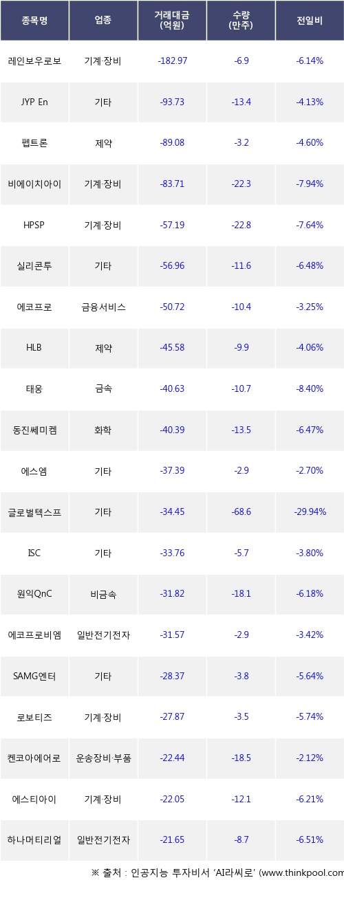 외국인 투자자의 순매도 상위 20개 종목은 레인보우로보틱스, JYP Ent., 펩트론, 비에이치아이, HPSP, 실리콘투, 에코프로, HLB, 태웅, 동진쎄미켐등이다.