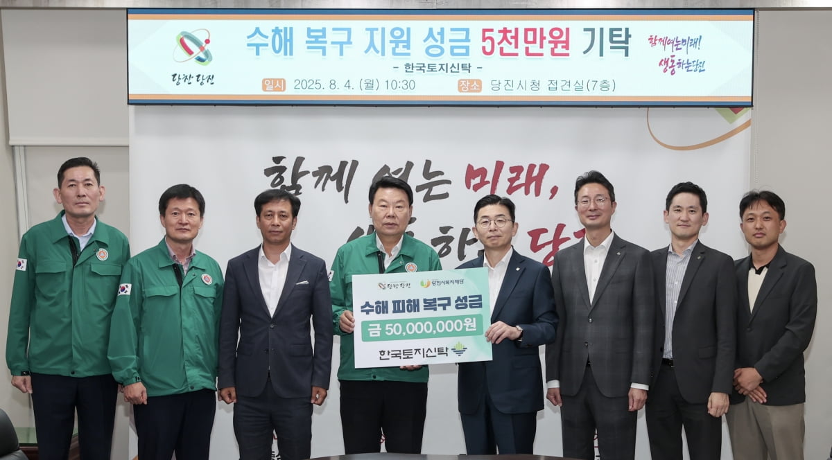 한국토지신탁 관계자는 “수해로 어려움을 겪고 있는 당진 시민들이 하루빨리 일상을 회복하시길 바라는 마음을 담아 성금을 전달했다”며 “기업과 지역사회가 함께 발전하는 사회적 책임경영을 지속해 나가겠다”고 말했다.