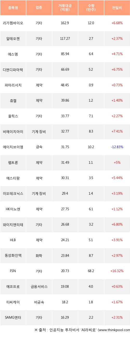 기관 투자자의 순매수 상위 20개 종목은 리가켐바이오, 알테오젠, 에스엠, 디앤디파마텍, 파마리서치, 휴젤, 올릭스, 비에이치아이, 에이치브이엠, 펩트론등이다.