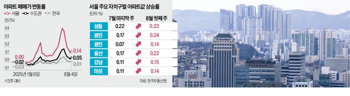 7일 한국부동산원에 따르면 이번주(지난 4일 기준) 서울 아파트 매매가는 한 주 전보다 0.14% 올랐다. 지난주(0.12%)보다 오름폭이 커졌다. 서울 아파트값 상승률은 6월 넷째 주 0.43%로 2018년 9월 둘째 주(0.45%) 후 최고치를 기록했다. 6·27 대책 이후 5주 연속 오름폭이 둔화했다가 이번에 반등한 것이다.