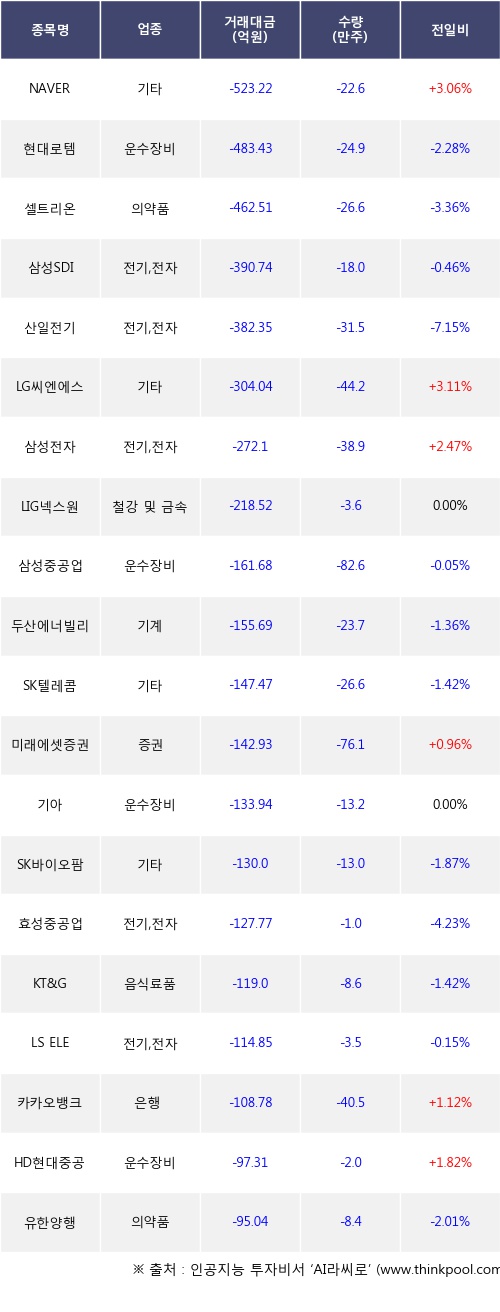 외국인 투자자의 순매도 상위 20개 종목은 NAVER, 현대로템, 셀트리온, 삼성SDI, 산일전기, LG씨엔에스, 삼성전자, LIG넥스원, 삼성중공업, 두산에너빌리티등이다.