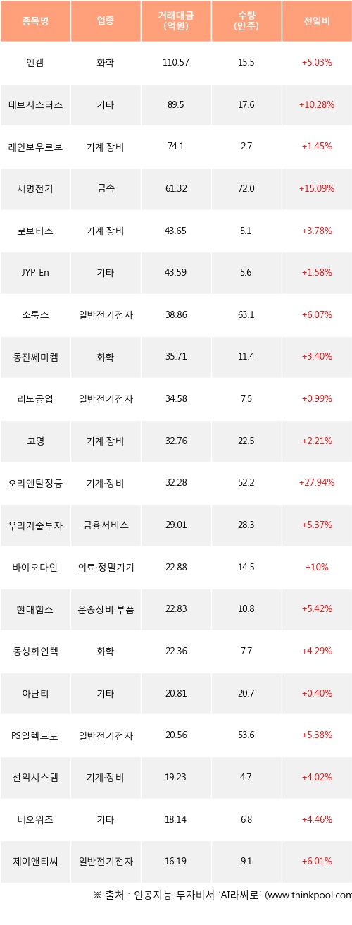 외국인 투자자의 순매수 상위 20개 종목은 엔켐, 데브시스터즈, 레인보우로보틱스, 세명전기, 로보티즈, JYP Ent., 소룩스, 동진쎄미켐, 리노공업, 고영등이다.