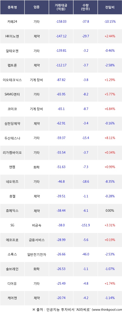 외국인 투자자의 순매도 상위 20개 종목은 카페24, HK이노엔, 알테오젠, 펩트론, 이오테크닉스, SAMG엔터, 코미코, 삼천당제약, 두산테스나, 리가켐바이오등이다.