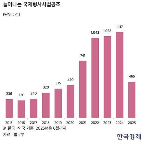 국경을 넘는 범죄가 증가하면서 우리 정부가 외국에 정식 요청한 형사사법 공조 건수가 지난해 역대 최대치를 기록했다. 범죄의 전자화와 비대면화가 심화하면서 국내 수사기관이 해외 사법당국에 수사나 증거를 요청하는 사례가 늘어나는 것이다. 자본 이동이 비교적 자유로운 해외로 유출된 범죄수익 환수 필요성이 커지면서 공조 역량의 중요성은 더욱 부각될 전망이다.