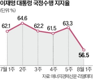 리얼미터가 에너지경제신문 의뢰를 받아 지난 4∼8일 전국 18세 이상 유권자 2506명을 대상으로 실시한 조사에서 이 대통령의 국정 수행 평가 질문에 응답자 56.5%가 ‘잘함’이라고 답했다. 전주 대비 6.8%포인트 하락한 수치다. 이에 따라 이 대통령 지지도는 6주 만에 60% 선이 깨졌다.리얼미터는 조사 기간 초반에는 주식 양도세 대주주 기준 논란과 이춘석 더불어민주당 의원의 주식 차명 거래 의혹, 후반에는 조국 전 조국혁신당 대표와 윤미향 전 의원의 특별사면 논란이 지지율 하락 요인으로 작용했다고 분석했다. 또 정청래 민주당 대표의 국민의힘 ‘패싱’ 등 대치 정국을 심화시키는 행보가 보수층과 중도층의 반감을 산 것으로 진단했다.