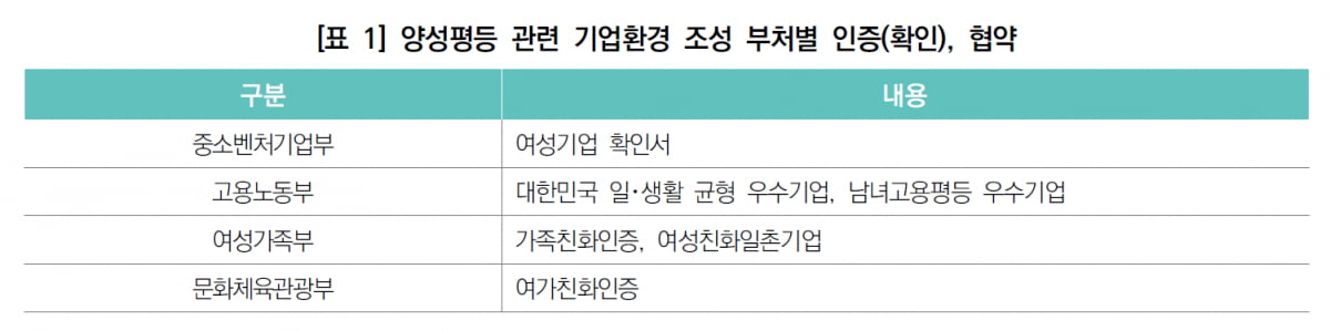 현재 운영 중인 여성이 일하기 좋은 우수기업 주요 인증제도는 △여성기업 확인서(중소벤처기업부) △대한민국 일·생활 균형 우수기업(고용노동부) △가족친화인증(여성가족부) △여가친화인증(문화체육관광부) △여성친화기업인증(지방자치단체) 등이다.