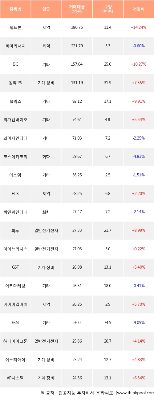 펩트론, ISC, 원익IPS 등은 전일 대비 주가가 상승했고, 파마리서치, 와이지엔터테인먼트, 코스메카코리아 등은 주가가 하락했다.