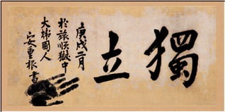 '독립'은 안 의사가 뤼순 감옥에서 일본인 간수에게 건넨 작품으로 '조국 독립을 위해 죽는다'는 신념을 두 글자에 압축했다. 현재 교토 류코쿠 대학이 보관 중이며, 국내 전시 이력은 있으나 완전 귀환은 아직이다.