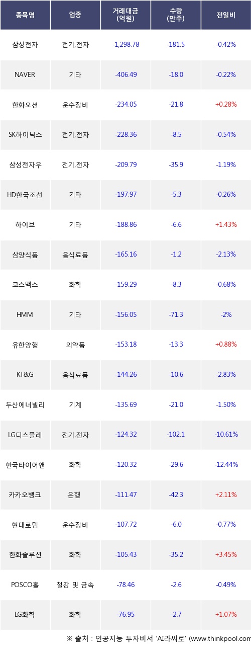 외국인 투자자의 순매도 상위 20개 종목은 삼성전자, NAVER, 한화오션, SK하이닉스, 삼성전자우, HD한국조선해양, 하이브, 삼양식품, 코스맥스, HMM등이다.