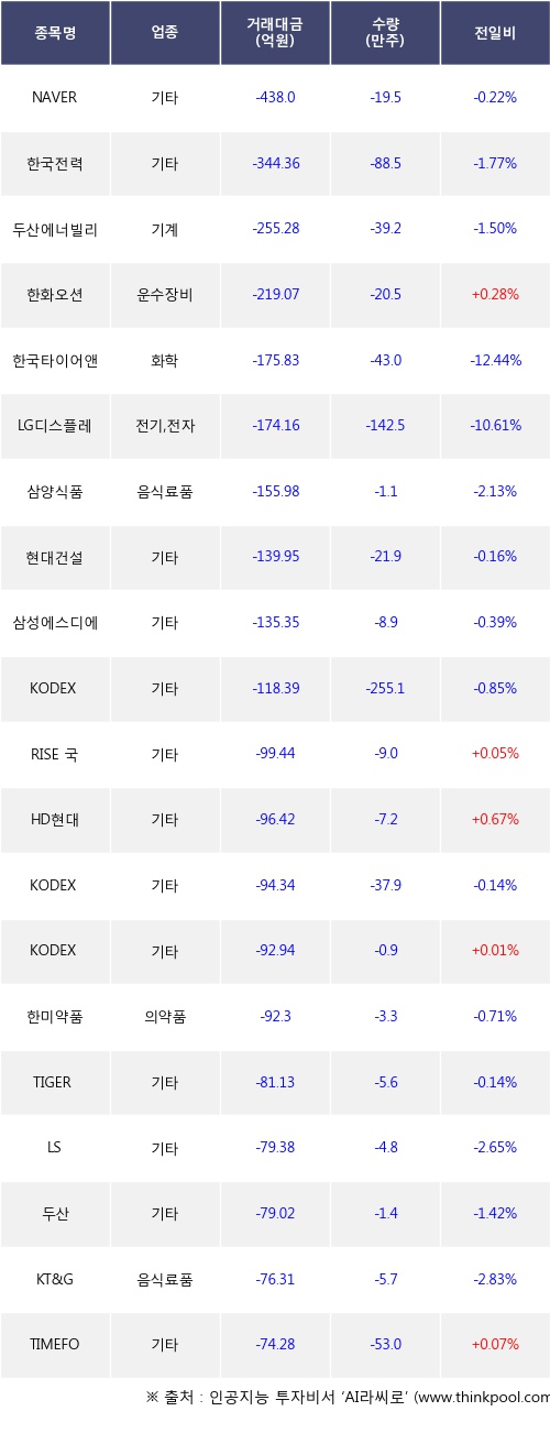 기관 투자자의 순매도 상위 20개 종목은 NAVER, 한국전력, 두산에너빌리티, 한화오션, 한국타이어앤테크놀로지, LG디스플레이, 삼양식품, 현대건설, 삼성에스디에스, KODEX 한국부동산리츠인프라등이다.