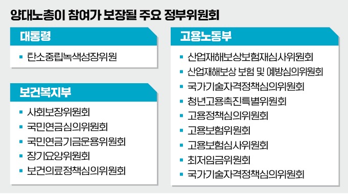 한 경제단체 관계자는 “노사 문제와 관련 없는 분야에서까지 노동계 참여가 확대되면 정부 위원회 효율성을 떨어뜨릴 수 있다”며 “양대 노총과 함께 미조직 노동자나 다른 단체에도 참여권을 보장해줄 필요가 있다”라고 말했다.