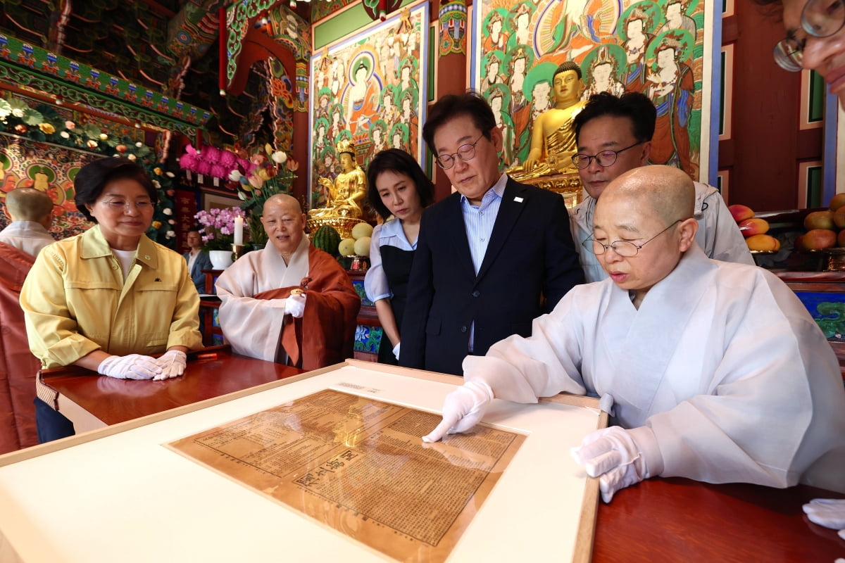 이후 이 대통령 부부는 진관사를 찾아 대웅전에서 향을 피우고 죽비 소리와 함께 삼배를 올렸다. 진관사는 일제 강점기 당시 일장기 위에 먹물로 태극 문양과 4괘를 덧칠한 ‘진관사 태극기’로 유명한 사찰이다. 이 대통령 부부는 체험관에서 가벼운 명상과 차담을 갖고 계호 스님이 준비한 저녁 공양을 함께 나눴다. 이 대통령은 앞으로 있을 정상회담 일정을 잘 해내야한다고 언급했다고 강 대변인은 전했다. 또 “어지러웠던 지난날을 뒤로 하고, 국정을 정상화하는 데 매진하고 있다”고 강조했다고 한다.