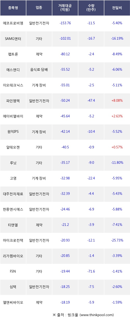 기관 투자자의 순매도 상위 20개 종목은 에코프로비엠, 삼양컴텍, SAMG엔터, 펩트론, 에스앤디, 이오테크닉스, 파인엠텍, 에이비엘바이오, 원익IPS, 알테오젠등이다.