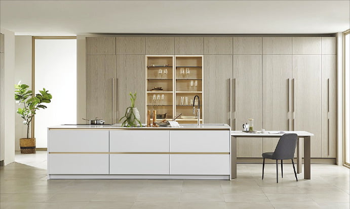 한샘은 ‘미니멀라이프의 시작, No.1 키친 한샘키친’ 캠페인을 전개하며 유로 키친 시리즈 2종을 재단장했다. 고강도 강화유리와 알루미늄 프레임을 결합한 ‘유로 700 그레이스’와 유럽 미장 스타일의 스톤 텍스처를 구현한 ‘유로 700 베일’이 대표적이다. 슬라이딩 벽장, 적층 팬트리 등 수납 유닛 6종을 새로 내놓고 주방 공간을 보다 깔끔하고 효율적으로 꾸밀 수 있도록 했다.