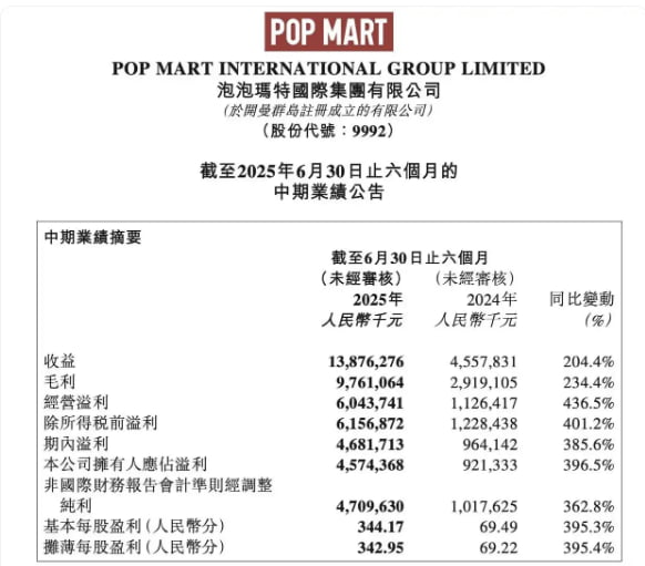 팝마트는 올해 상반기 순이익이 45억7400만위으로 전년 대비 396.5% 증가했다고 전날 밝혔다. 같은 기간 매출은 전년 대비 204.4% 증가한 138억8000만위안으로 집계됐다. 팝마트의 상반기 매출과 순이익은 모두 지난해 연간 실적을 웃돌았다. 작년 팝마트 매출은 130억4000만위안, 순이익은 34억위안이다. 상반기 대표 캐릭터 '라부부'가 속해있는 '더 몬스터즈' 시리즈를 비롯해 몰리, 스컬판다, 크라이베이비 등 5대 핵심 지식재산권(IP) 관련 매출이 각각 10억 위안 이상을 기록하며 실적을 이끌었다. 특히 더 몬스터즈 매출은 올해 상반기 전년 대비 668% 급증한 48억1000만 위안을 기록했다. 전체 매출의 3분의 1에 해당한다.특히 미국 시장의 성장세가 두드러지고 있다. 상반기 미주와 유럽 및 기타 지역의 오프라인 매출은 각각 22억6000만 위안과 4억8000만 위안으로 전년 대비 1142.3%와 729.2% 뛰었다. 아시아·태평양 지역의 매출은 28억5000만 위안으로 257.8% 증가했고, 중국은 82억8000만위안으로 135.2% 늘었다. 팝마트 설립자이자 최고경영자(CEO)인 왕닝은 실적 발표회에서 "올해 상반기 사상 최고 실적을 거뒀다"며 "올해 연매출 300억위안(약 5조8000억원) 달성은 어렵지 않을 것"이라고 말했다