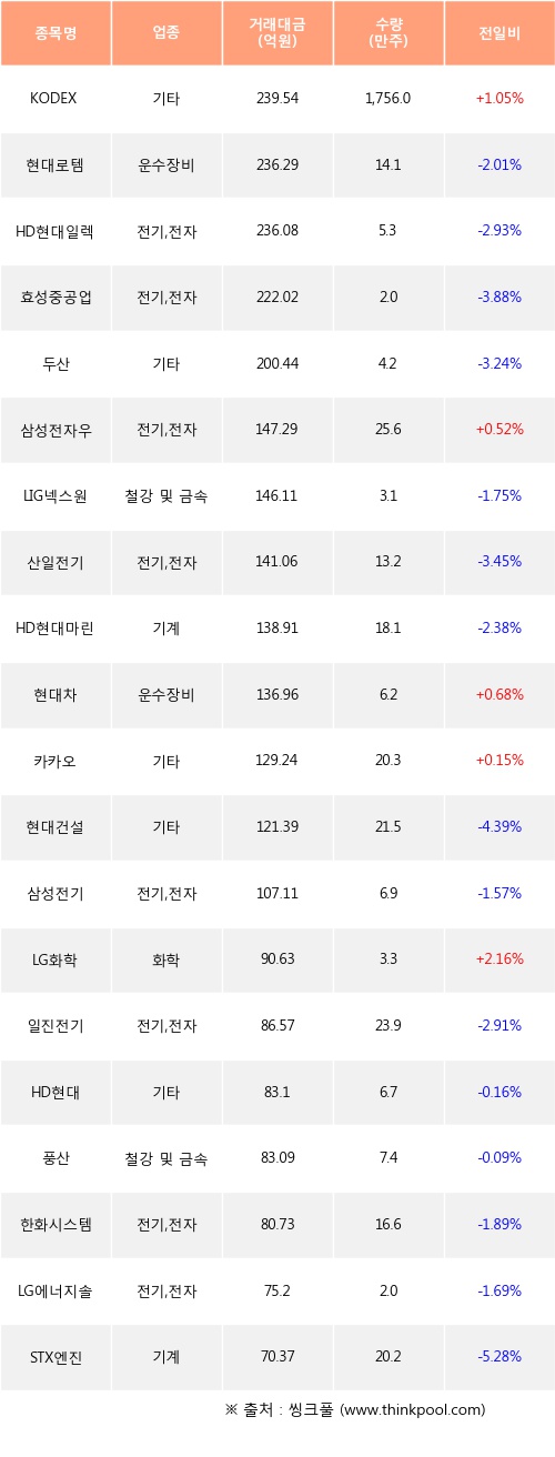 KODEX 200선물인버스2X, 삼성전자우, 현대차 등은 전일 대비 주가가 상승했고, 현대로템, HD현대일렉트릭, 효성중공업 등은 주가가 하락했다.