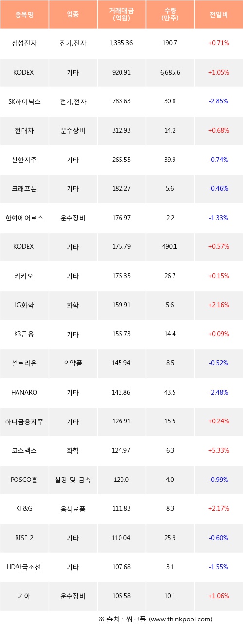 삼성전자, KODEX 200선물인버스2X, 현대차 등은 전일 대비 주가가 상승했고, SK하이닉스, 신한지주, 크래프톤 등은 주가가 하락했다.