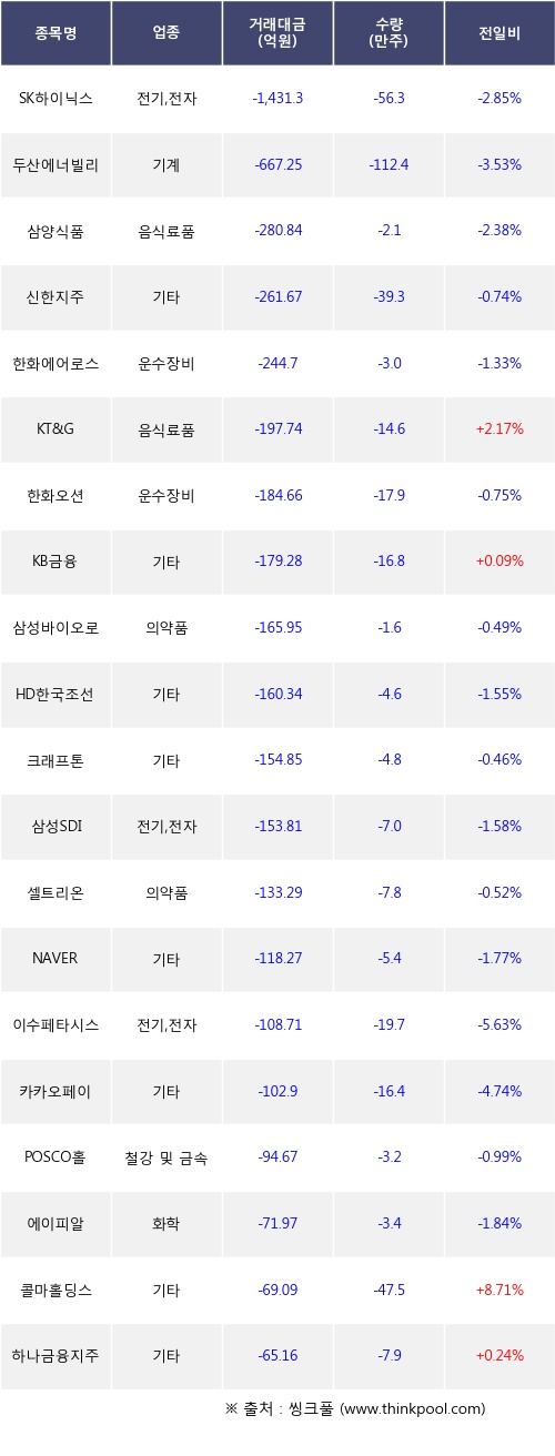 외국인 투자자의 순매도 상위 20개 종목은 SK하이닉스, 두산에너빌리티, 삼양식품, 신한지주, 한화에어로스페이스, KT&G, 한화오션, KB금융, 삼성바이오로직스, HD한국조선해양등이다.