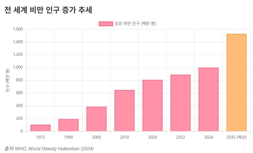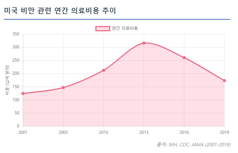 GLP-1의 가장 경제적 기여는 천문학적으로 증가하는 의료비 부담 완화다. 미국에서만 비만 관련 의료비 지출은 연간 약 1730억 달러에 달한다. 세계비만연맹은 전 세계 비만 관련 경제적 비용이 2035년까지 4조 달러를 넘어설 것으로 전망했다.