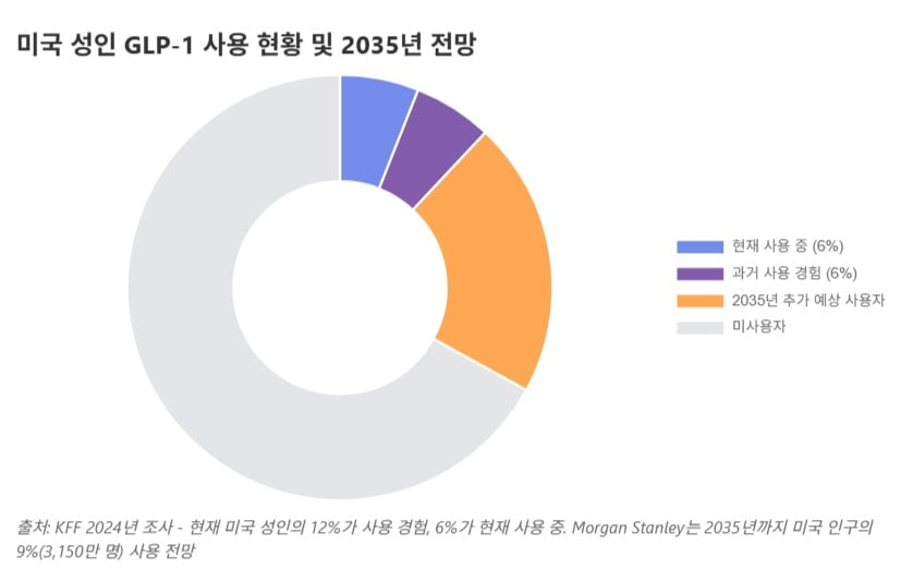 글로벌 투자은행 모건스탠리는 '오젬픽 이코노미'라고 설명했다. 오는 2035년에는 미국 인구의 9%에 달하는 3150만 명이 GLP-1 약물을 사용할 것으로 전망했다. 체중 감량이 대중화돼 사회 전체적으로 소비 행태와 건강지표가 크게 변할 수 있다는 전망이 나온다.