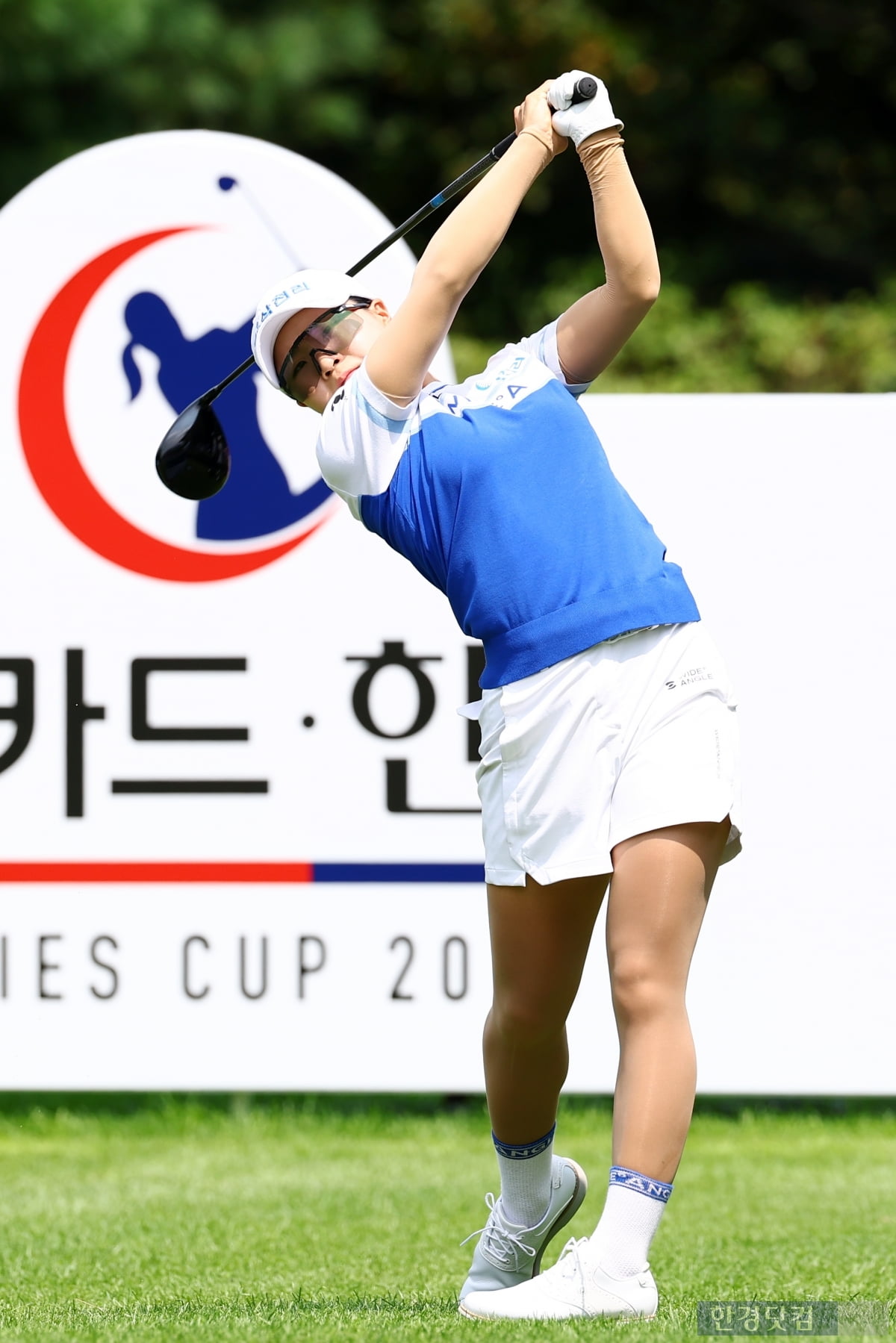 한국여자프로골프(KLPGA)투어 ‘BC카드·한경 레이디스컵 2025’ 1라운드 경기가 21일 경기도 포천시 포천힐스CC에서 열렸다. 대회에 출전한 고지원이 1번 홀에서 티샷하고 있다.