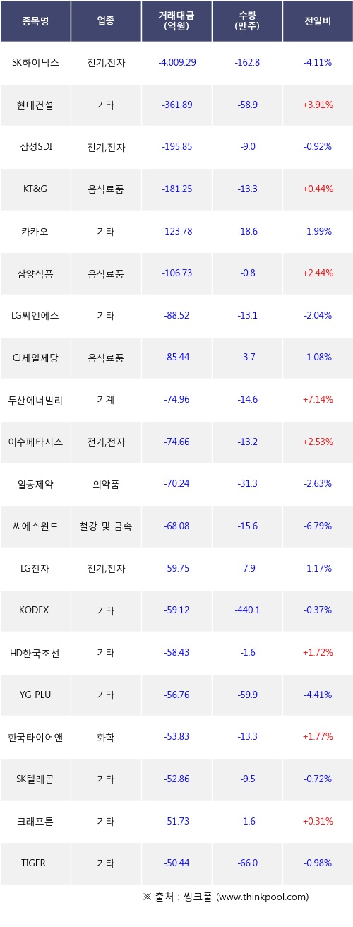 외국인 투자자의 순매도 상위 20개 종목은 SK하이닉스, 현대건설, 삼성SDI, KT&G, 카카오, 삼양식품, LG씨엔에스, CJ제일제당, 두산에너빌리티, 이수페타시스등이다.