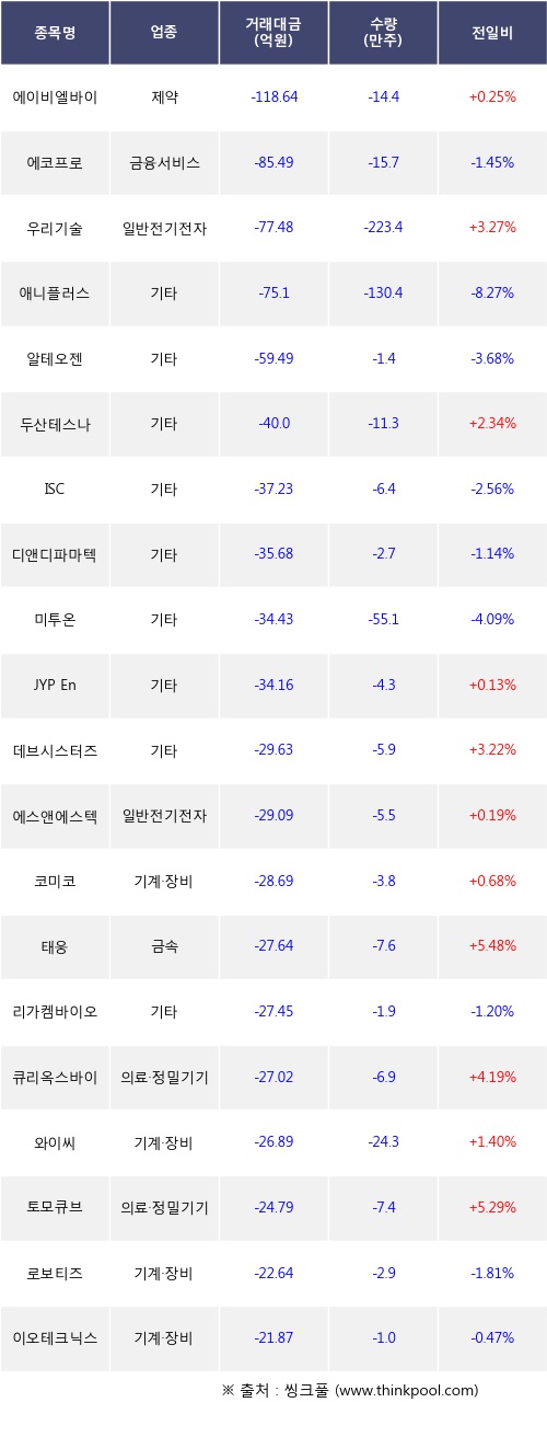 외국인 투자자의 순매도 상위 20개 종목은 에이비엘바이오, 에코프로, 우리기술, 애니플러스, 알테오젠, 두산테스나, ISC, 디앤디파마텍, 미투온, JYP Ent.등이다.