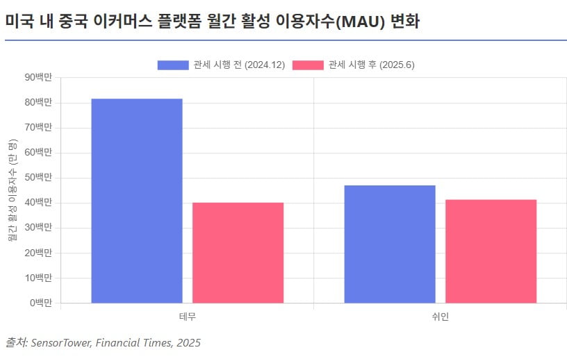 실제 중국 플랫폼들은 한때 이용자 이탈과 매출 감소를 겪고 있다. 영국 파이낸셜타임스(FT)에 따르면 트럼프 행정부의 고율 관세 이후 테무와 쉬인의 미국 내 활성 이용자 수(MAU)는 급감했다. 시장조사업체 센서타워 집계로 올 3~6월 미국에서 테무 월간 활성 이용자는 51% 감소해 4020만 명에 그쳤다. 같은 기간 쉬인 월간 이용자도 12% 줄어 4140만 명이 됐다. 블룸버그 통신은 관세 인상 후 두 회사의 미국 매출은 약 20% 감소를 기록했다고 전했다.