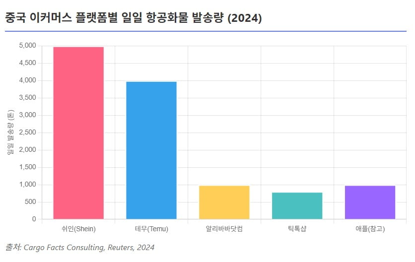 2024년 기준으로 쉬인은 하루 약 5000톤, 테무는 약 4000톤의 화물을 전 세계로 발송했다. 전통적인 항공 화물의 '큰 손'인 애플이 신제품 출시 시즌에 기록한 일일 최대 물동량 1000톤을 압도하는 수치다. 알리바바닷컴과 틱톡샵의 물량을 더하면 중국 플랫폼에서 매일 발생하는 항공 화물 수요는 보잉 777 화물기 약 108대를 가득 채우고도 남는 규모다.