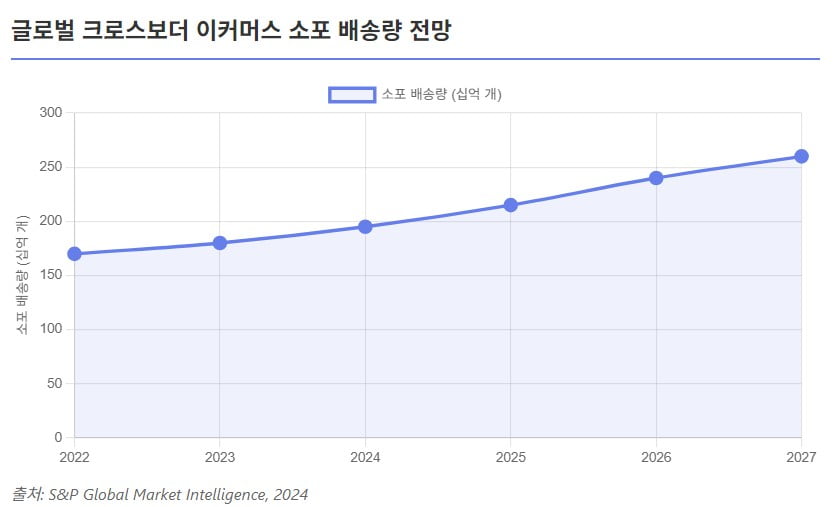 26일 글로벌 시장조사업체 S&P에 따르면 전 세계 크로스보더(cross-border·국경을 넘어서 이루어지는 거래) 이커머스 소포 배송량은 2022년에 약 1700억개에 달했다. 오는 2027년까지 이보다 50% 이상 증가할 전망이다. 중국 이커머스 플랫폼의 영향이 컸다.
