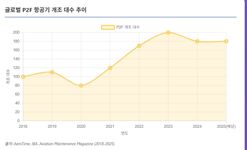 이런 수요에 힘입어 글로벌 P2F 시장은 호황을 맞았다. 2018년 전 세계 P2F 개조는 약 100대 수준이었다. 2021~2022년 온라인 상거래 시장 호황으로 개조 계약이 급증하면서 2023년에는 약 200대의 항공기가 개조돼 사상 최대를 기록했다
