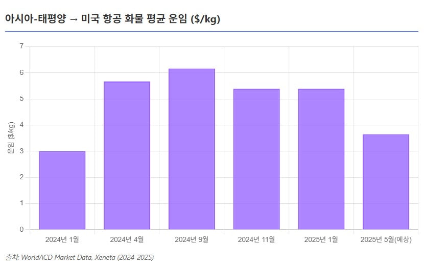 항공시장 분석업체 제네타(Xeneta)에 따르면 4월 동남아시아→북미 노선의 항공 화물 운임은 평균 13% 상승해 kg당 5.67달러에 달했다. 동북아(중국·한국 등)→북미 노선도 운임이 10% 이상 올랐다. 같은 기간 북미→동북아 노선 운임도 14% 뛰었다. 이는 중국 측도 미국 관세에 맞서 보복관세를 예고하자 미국 수출업자들이 서둘러 대중 물량을 보낸 결과라는 분석이다.