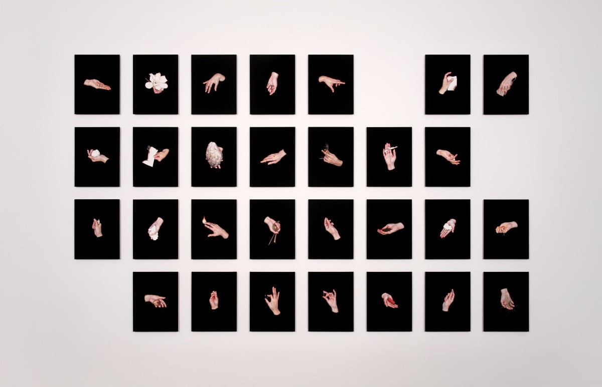 인물은 늘 뒷모습이나 옆모습을 하고 있고, 그나마도 보이는 정면의 얼굴은 손이나 돌로 일부를 가리거나 눈을 감은 채다. 이런 장면들은 묘한 상상력을 자극한다. 동양화를 말할 때 ‘여백의 미’가 가장 먼저 등장하지만 이진주는 그 여백을 완전히 소거한다. 역설적이게도 여백이 사라진 자리에 파편화한 신체의 일부, 장면의 일부가 더 강렬하고 선명하게 도드라진다. 이번 전시에선 3층 전시장에 걸린 ‘대답들’(2024) 연작에서 블랙 페인팅의 정수를 만날 수 있다. 손을 묘사한 작품 29점을 유기적으로 연결해 다양한 사건과 상황을 연상시킨다. 4행 8열로 배치돼 3개의 자리가 비워져 있는데, 작가는 “그 여백마저 작품의 일부로 문장과 문장 사이 쓰이지 않은 것들의 공간”이라고 말한다.