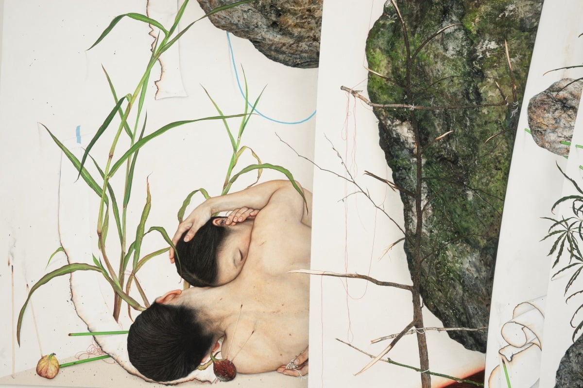 이번 전시의 대표작인 ‘슬픔과 돌’(2025)은 6개의 흰색 장막이 사선으로 줄지어 연결된다. 바위와 인물, 식물, 사물이 뒤엉킨 모습으로 가로 3.8m, 세로 3.2m. 이진주 작가의 ‘변형 캔버스Shaped Canvas’ 시리즈 중 최대 규모다.