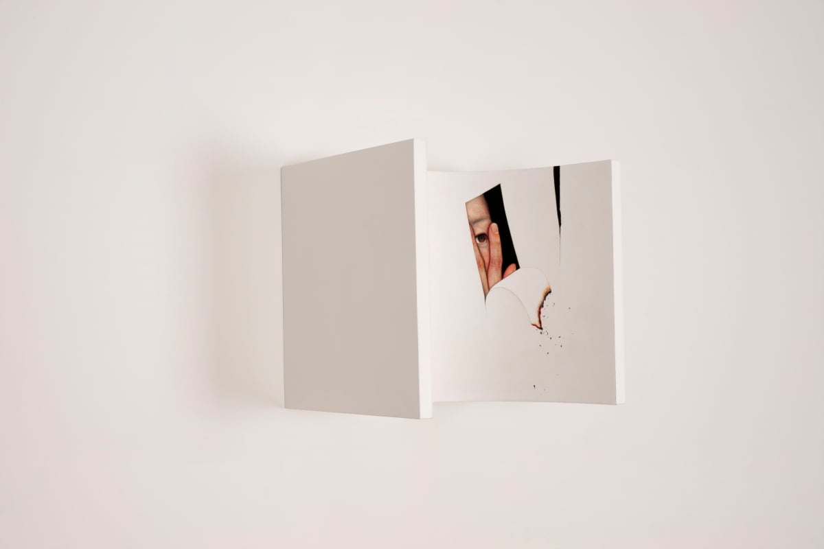 ‘겹쳐진-사라진’(2025) 역시 2개의 기다란 직사각형 패널이 한 면만 맞닿도록 결합해 조각처럼 설치했다. 오목한 안쪽에 블랙 페인팅은 가녀린 인물이 거대한 돌을 품고 있다. 한쪽에선 보이고, 다른 한쪽에선 보이지 않는 회화. 인물은 어떤 얼굴을 하고 있을까, 아무도 알 수 없다. 작가는 장막에 대해 이렇게 말한다.