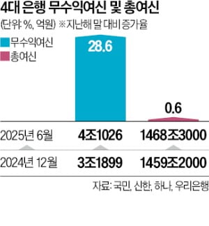 25일 4대 은행이 공시한 올해 반기보고서에 따르면 이들 은행의 무수익여신 잔액은 지난 6월 말 기준 4조1026억원이었다. 지난해 말(3조1899억원) 대비 28.6% 증가했다. 4대 은행 무수익여신 잔액이 4조원을 넘어선 것은 이번이 처음이다.반면 4대 은행 총여신 잔액은 같은 기간 1459조2000억원에서 1468조3000억원으로 0.6% 늘어나는 데 그쳤다. 무수익여신 증가 속도가 전체 대출자산과 비교해 더 가파르다는 뜻이다. 총여신에서 무수익여신이 차지하는 비율도 0.22%에서 0.28%로 높아졌다.