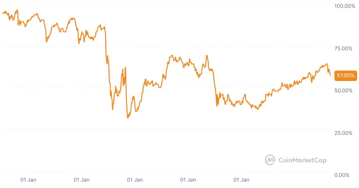 상황이 이렇다보니 비트코인 도미넌스(시장 점유율)도 하락세다. 코인마켓캡에 따르면 비트코인 도미넌스는 이날 기준 57.5%로, 1개월 전(60.6%)보다 3.1%포인트 하락했다. 같은 기간 이더리움 도미넌스는 11.6%에서 14.3%로, 2.7%포인트 올랐다. 더블록은 "(비트코인 도미넌스) 하락세는 투자자들이 알트코인으로 관심을 돌리고 있다는 점을 시사한다"고 전했다.