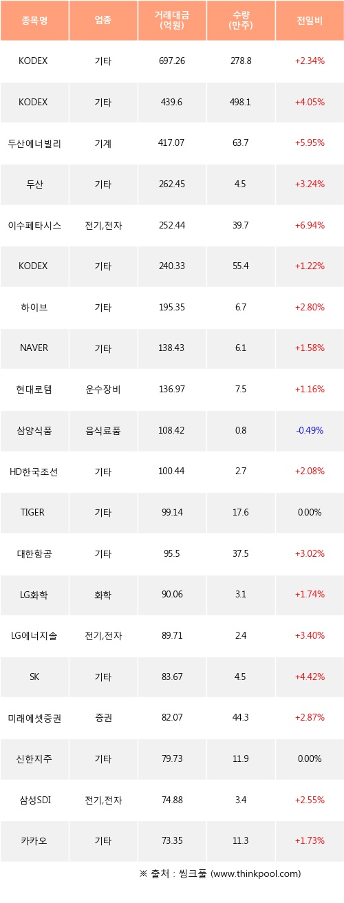 기관 투자자의 순매수 상위 20개 종목은 KODEX 레버리지, KODEX 코스닥150레버리지, 두산에너빌리티, 두산, 이수페타시스, KODEX 200, 하이브, NAVER, 현대로템, 삼양식품등이다.